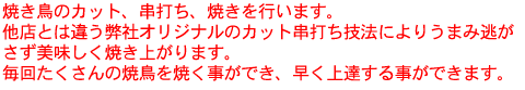 皮・せせり・つくねのカット・串打ち 塩の振り方 ささみ・皮・せせり・つくねの焼き方 |