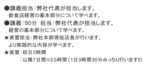 | 1日目 | 講義1.5時間 | 衛生管理・防火管理・事業計画書の作成・目標設定